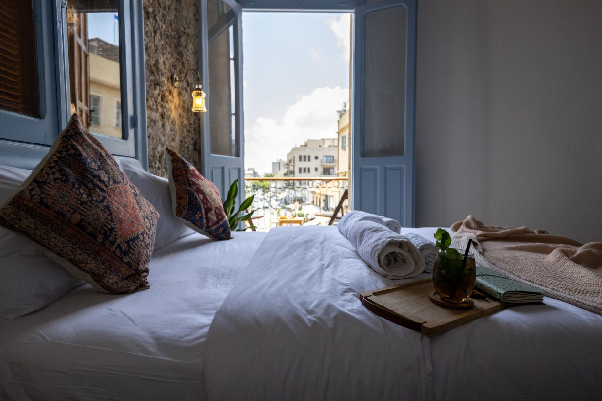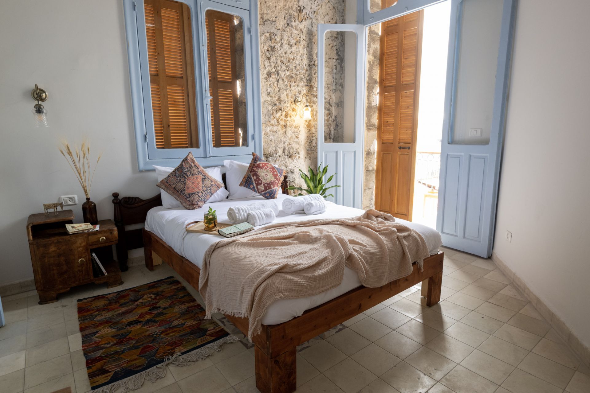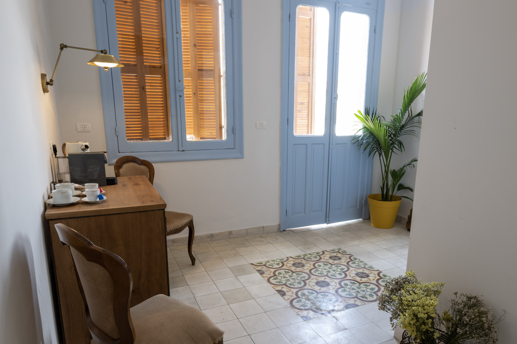 Indulge in a spacious and beautiful air-conditioned suite, featuring two opulent rooms. The entrance room includes a coffee/tea stand, electric kettle, cozy sofa, and bathroom. The second room boasts a comfortable double bed, dresser, and closet. Relax on one of two balconies with stunning views of the Flea-market. Enjoy complimentary high-speed Wi-Fi throughout your stay.
