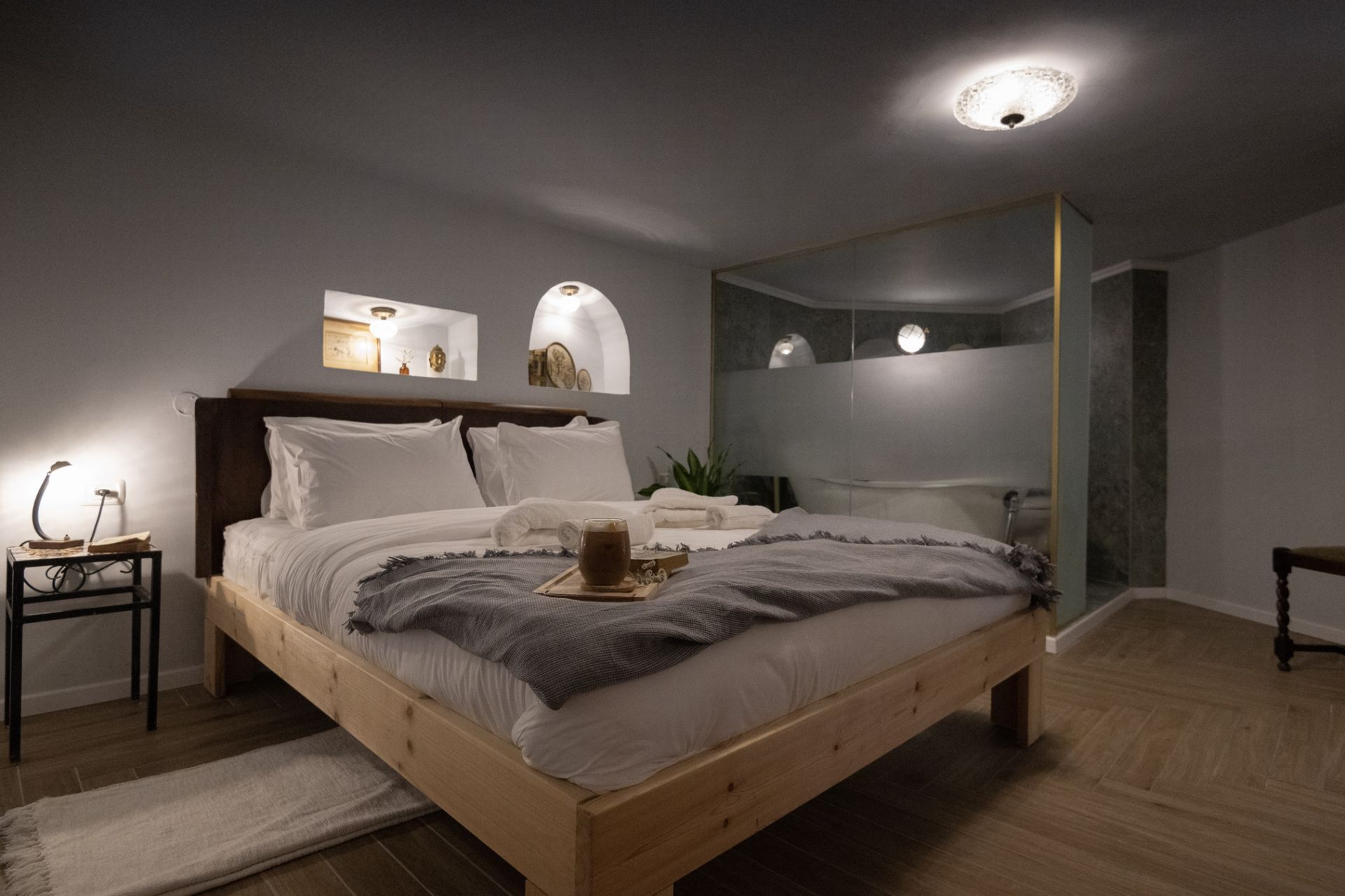 Experience an intimate and unforgettable stay in our cozy studio. Immerse yourself in the charming atmosphere of our open space studio, designed for a romantic getaway. Sink into a comfortable double bed, with a luxurious bath in the room for a relaxing soak. Enjoy a warm cup of coffee or tea at the in-room coffee stand, perfect for a cozy morning or romantic evening. Ideal for couples or solo travelers, with a minimum guest age of 18. Please note that our property is undergoing renovations, and while repair teams may be present during your stay, we have discounted our rate to reflect this. We invite you to indulge in a romantic escape and discover the beauty of our newly renovated look.